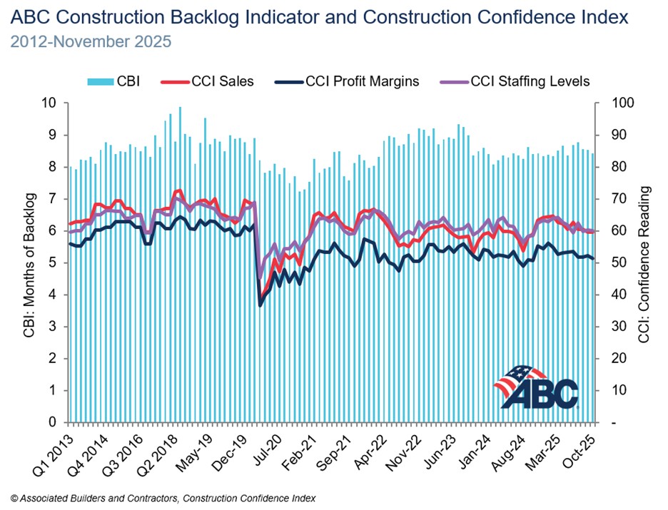Associated Builders and Contractors reported today that its Construction Backlog Indicator fell to 8.1 months in November, according to an ABC member survey conducted Nov. 20 to Dec. 8. The reading is down 0.3 months since both October 2025 and November 2024.