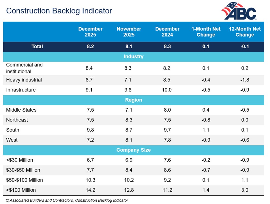 Associated Builders and Contractors reported today that its Construction Backlog Indicator rose to 8.2 months in December, according to an ABC member survey conducted Dec. 22 to Jan. 7. The reading is up 0.1 months since November but down 0.1 months from December 2024.
