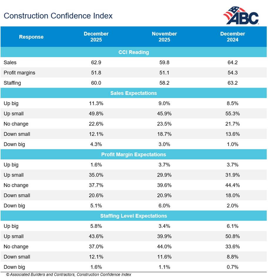 ABC’s Construction Confidence Index reading for sales, profit margins and staffing levels increased in December but are all down on a year-over-year basis. The readings for all three components remain above the threshold of 50, indicating expectations for growth over the next six months.