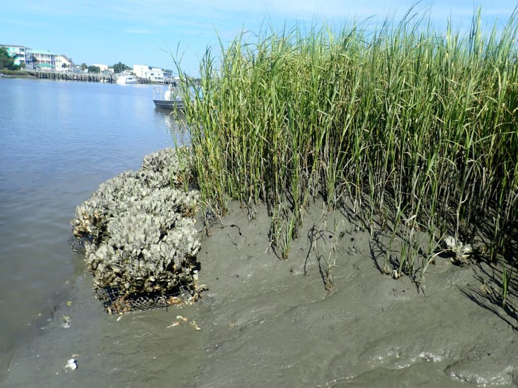 Main Photo (top of page) taken at Big Bay Creek behind Edisto Island – Bagged shell reef with marsh expanding in behind it. Notice the non-living shoreline area that has continued to erode. Photo courtesy of SCDNR.