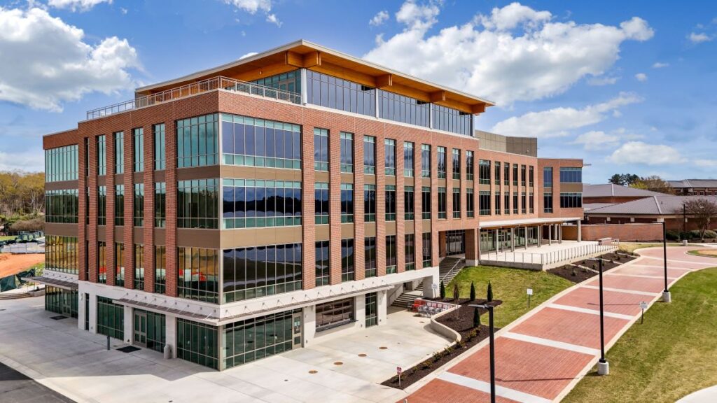 Clemson University’s new Nieri Family Alumni and Visitors Center sets a high standard for campus sustainability, design, and user experience. Located on the shores of Lake Hartwell next to the University’s Walker Golf Course, the five-story, 105,000-square-foot facility consolidates key student- and alumni-facing departments under one roof, creating a centralized hub that reflects the full Clemson journey.