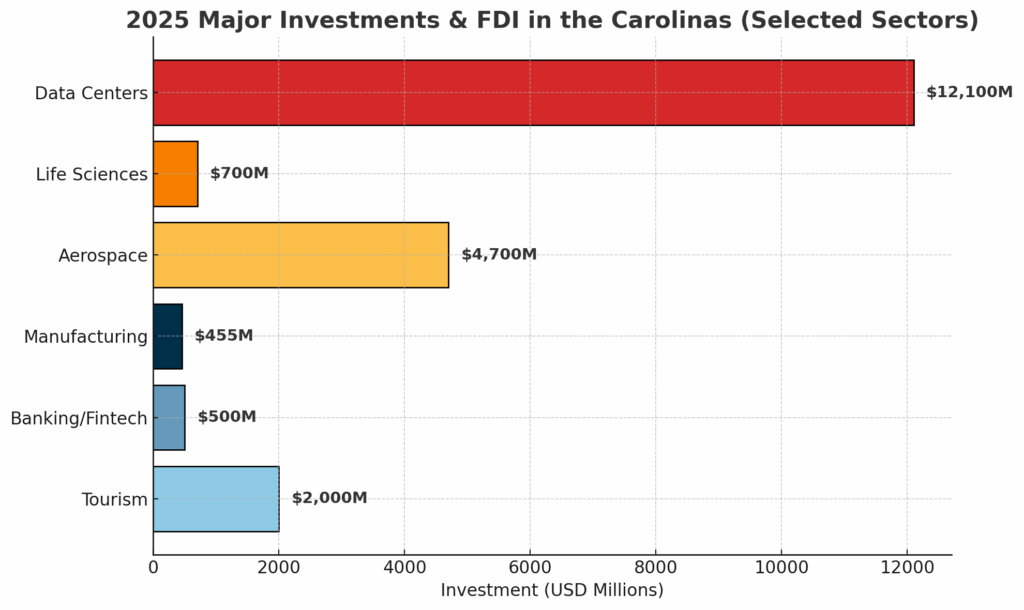 The Carolinas’ 2025 ledger reflects both breadth and depth: hyperscale data centers (AWS, Cielo), life sciences (Genentech), aerospace (JetZero), industrial reinvestments (PPG, Rolls-Royce), and finance-tech (Citi). Combined, these deals position the region as one of the most attractive in the U.S. for capital investment.
