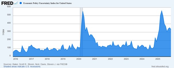 The tendency of the Trump administration to make headline-generating major policy changes generates costly uncertainty that causes economic decision makers to hunker down and postpone risky decisions. Figure 2, shows monthly values for the U.S. Economic Policy Uncertainty Index, which is based on the frequency of particular words found in a sample of daily newspapers and which correlates with reductions in economic activities. Note that April 2025 marks the recent peak. This was the month when Trump announced the start of his global trade war and the beginning of America’s golden age. The level of uncertainty then was about the same as that in 2020 associated with the start of the COVID pandemic and shutdown of the U.S. economy.