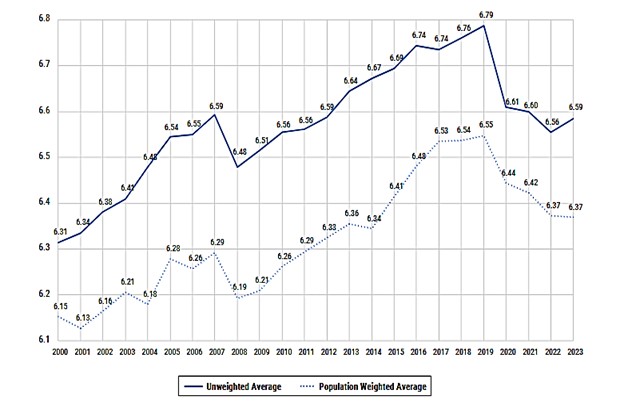 The effects of COVID-related centralized decision-making and increased regulation may be seen in the recently released Fraser Institute 2025 report on Economic Freedom of the World. Fraser’s freedom index rates up to 165 countries from 1970 through 2023 using five data categories: size of government, legal system and property rights, sound money, freedom to trade internationally, and regulation. When COVID hit, each of the five categories was affected by national governments to soften the pandemic’s effects. For the years 2000 through 2023, data for the average value of the overall index, unweighted and weighted by population, are shown in Figure 1 below. I call attention to the sharp decline that started in 2019 with a small recovery in 2023. In effect, 10 years of gains in freedom were erased by pandemic and related effects. I note that the top five free countries for 2023 are Hong Kong, Singapore, New Zealand, Switzerland, and the United States.