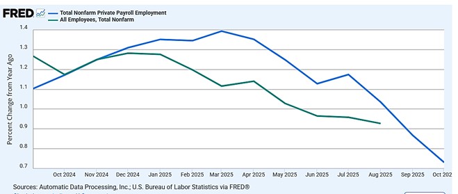 Given deportations and an aging population, US employment growth is falling. This presents a challenge for those who are counting on higher GDP growth. Estimates by the Pew Center indicate 750,000 immigrant workers have left the labor force since January 2025, and efforts by the Trump administration to ease the situation by accelerating use of a special visa for temporary agriculture workers have been snarled by the government shutdown.