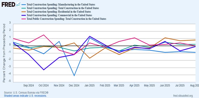 We will continue to have pent-up demand for housing, and falling mortgage rates will enliven things. But, remote employment and other COVID-induced work changes have changed the relationship between work and home. Commercial construction, shown by the purple line in Figure 4, is the second lively sector. This is led by the previously discussed explosive expansion of data centers for servicing AI.