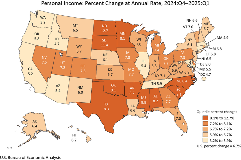 The same Commerce Department announcement reported on state income growth, which can differ significantly from GDP growth. Income includes retirement, investment and transfer payments in its calculation where GDP is the market value of all newly produced goods and services. As shown in the next map, South Carolina tied with Oklahoma for the 4th spot; North Carolina held the 6th highest position.