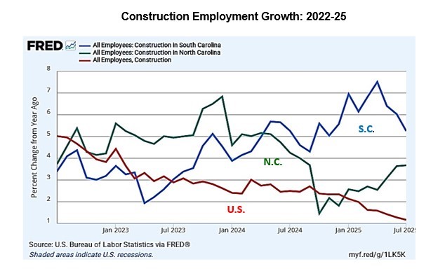 Evidence of the Carolinas’ high performance is seen in growth in construction employment. As shown in the accompanying chart, employment growth has been most robust in South Carolina while growth for North Carolina has also outstripped the national pace, which has been falling for a year.