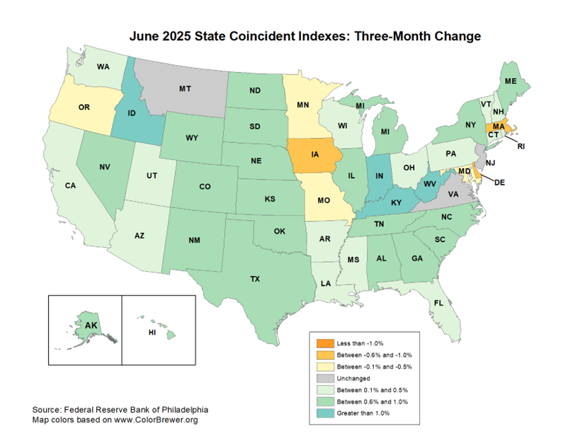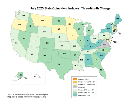 I next provide two maps, one for July 2025 and for June 2025, so that comparisons may be made. As can be seen, South Carolina is in the high-performance category for July. North Carolina ranks in the second highest category. I point out that the Southeast is a solid performing region. A quick comparison with the June map tells us that South Carolina’s leading indicator has gotten stronger, while North Carolina has held its own.