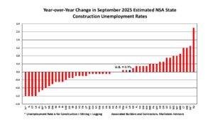 The national September 2025 not seasonally adjusted construction unemployment rate was 3.8%, a 0.1% increase from September 2024, according to a state-by-state analysis of U.S. Bureau of Labor Statistics data released today by Associated Builders and Contractors. The analysis found that just over half of states (26) had lower estimated construction unemployment rates over the same period,…